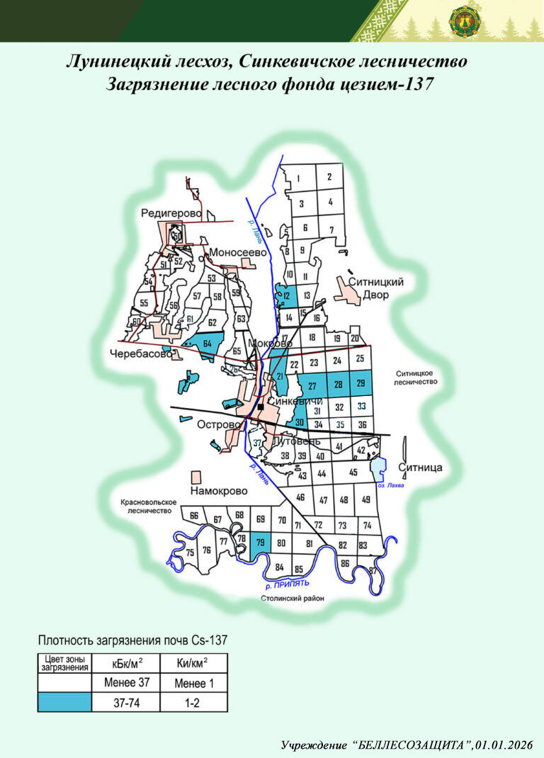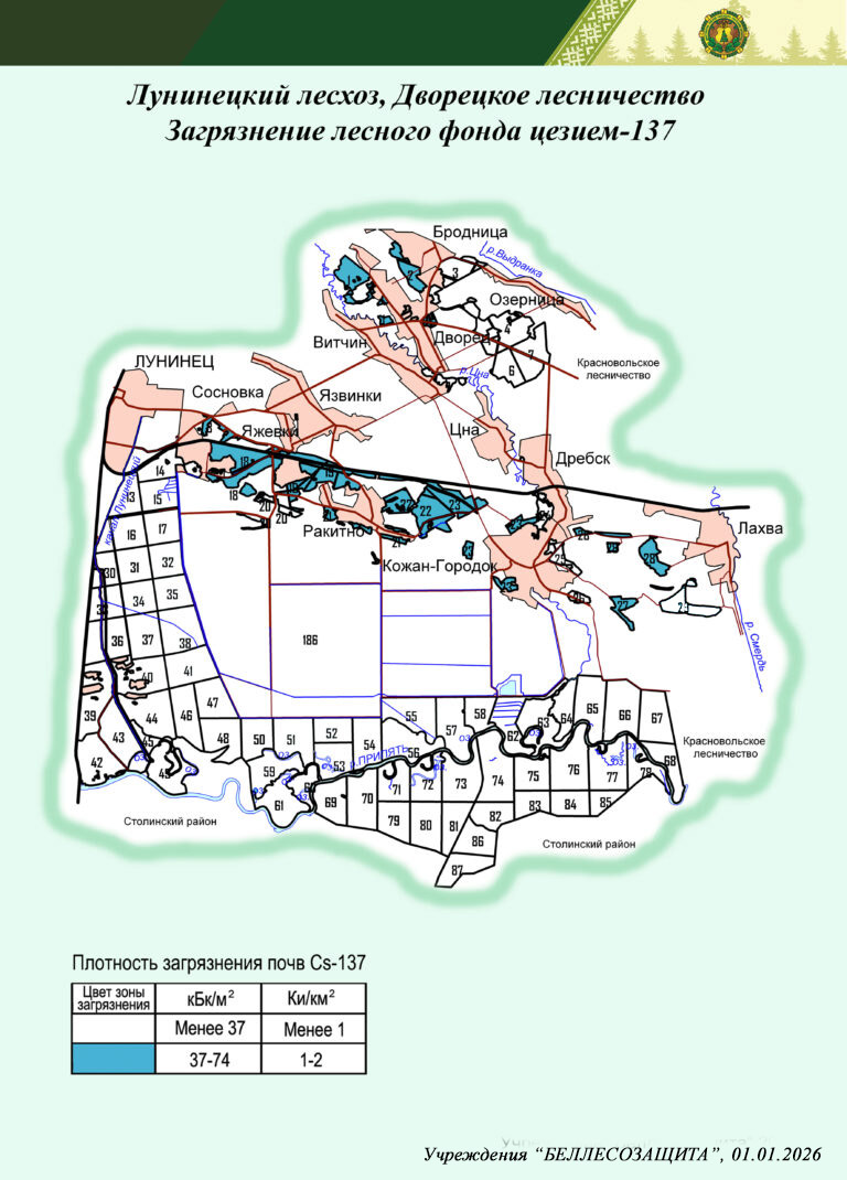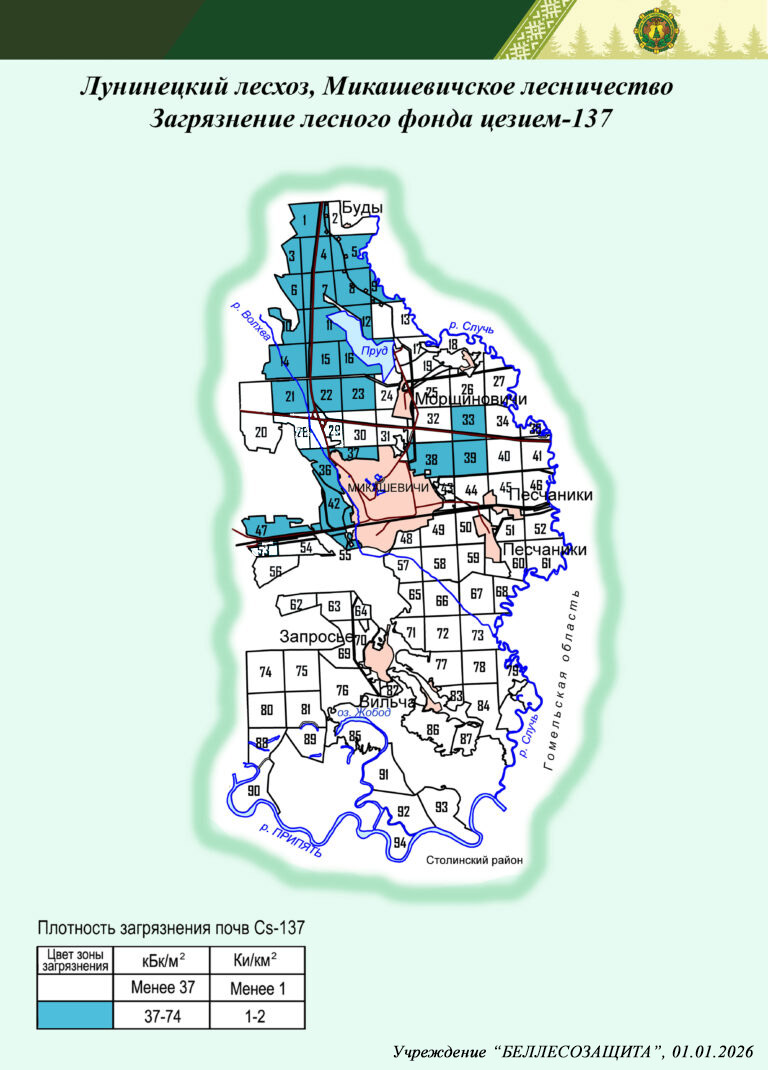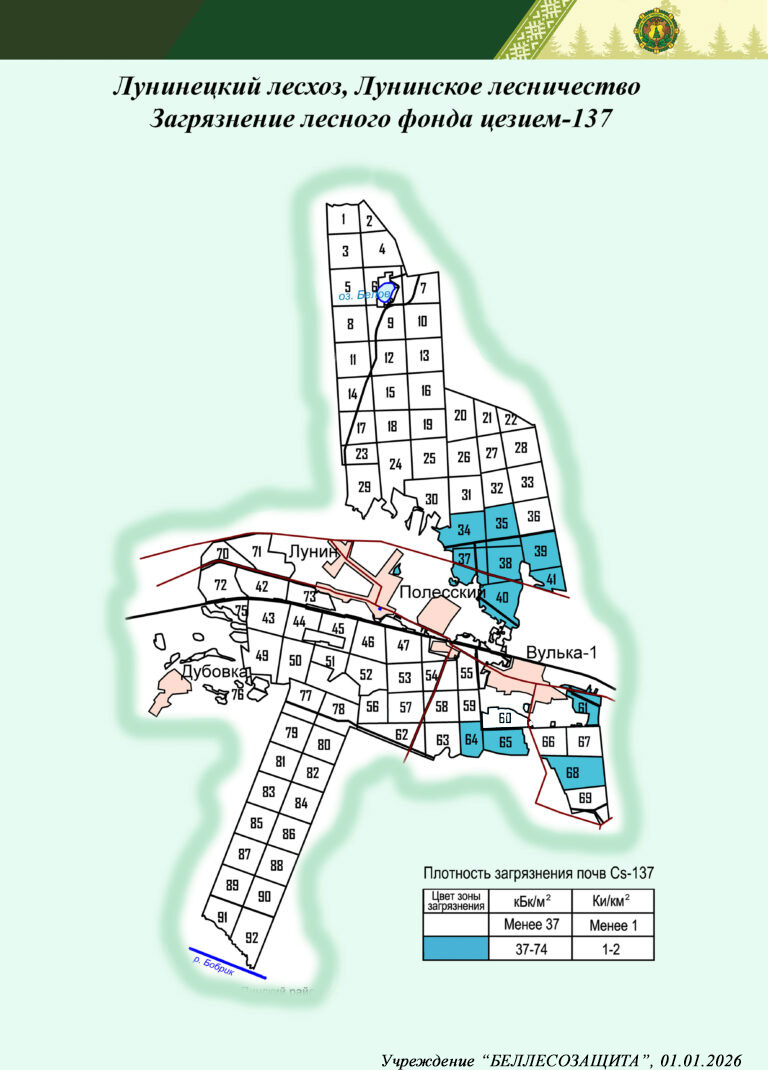 Радиоактивное загрязнение лесного фонда в лесничествах Лунинецкого лесхоза в 2026 г. и прогноз на 01.01.2035 г.