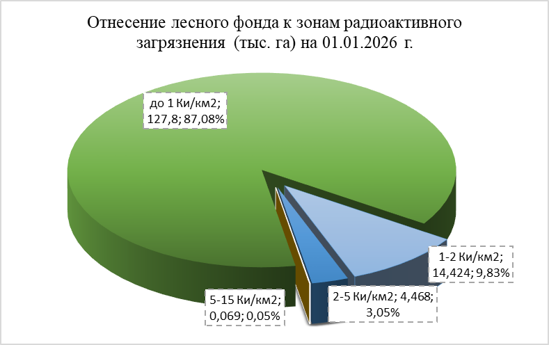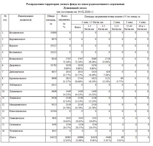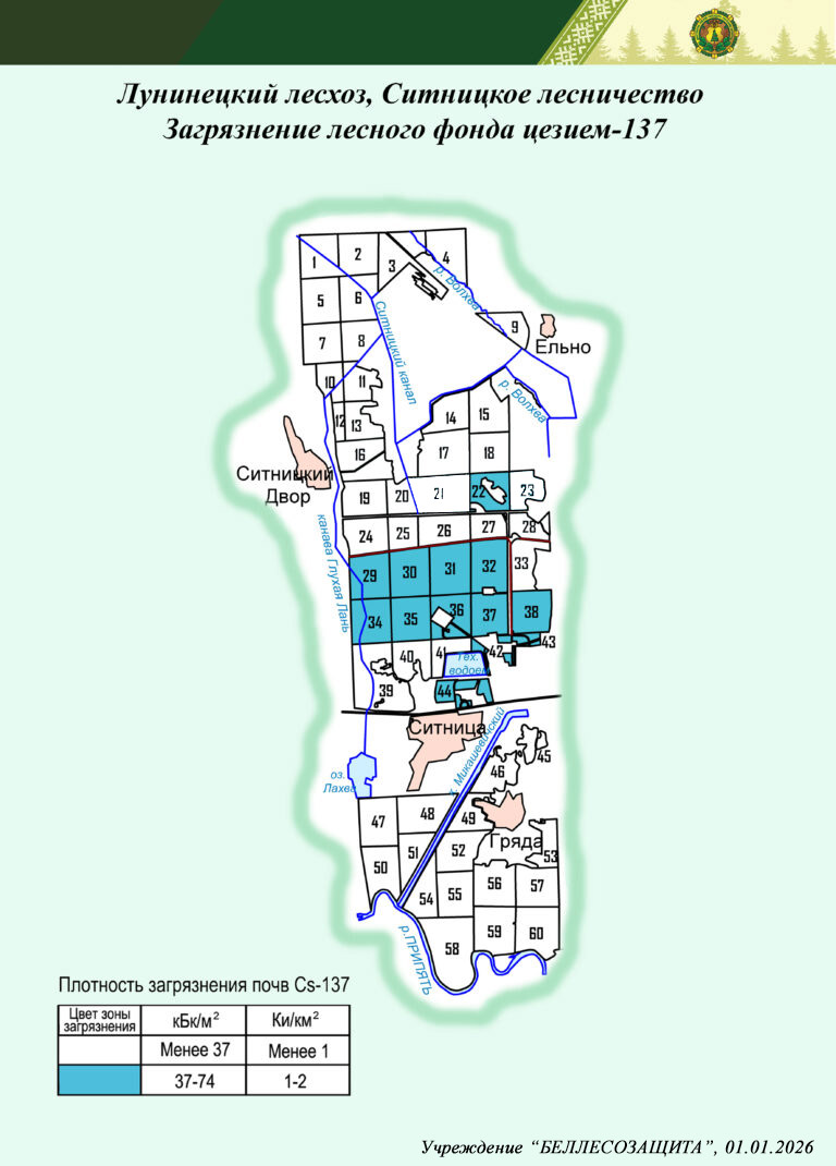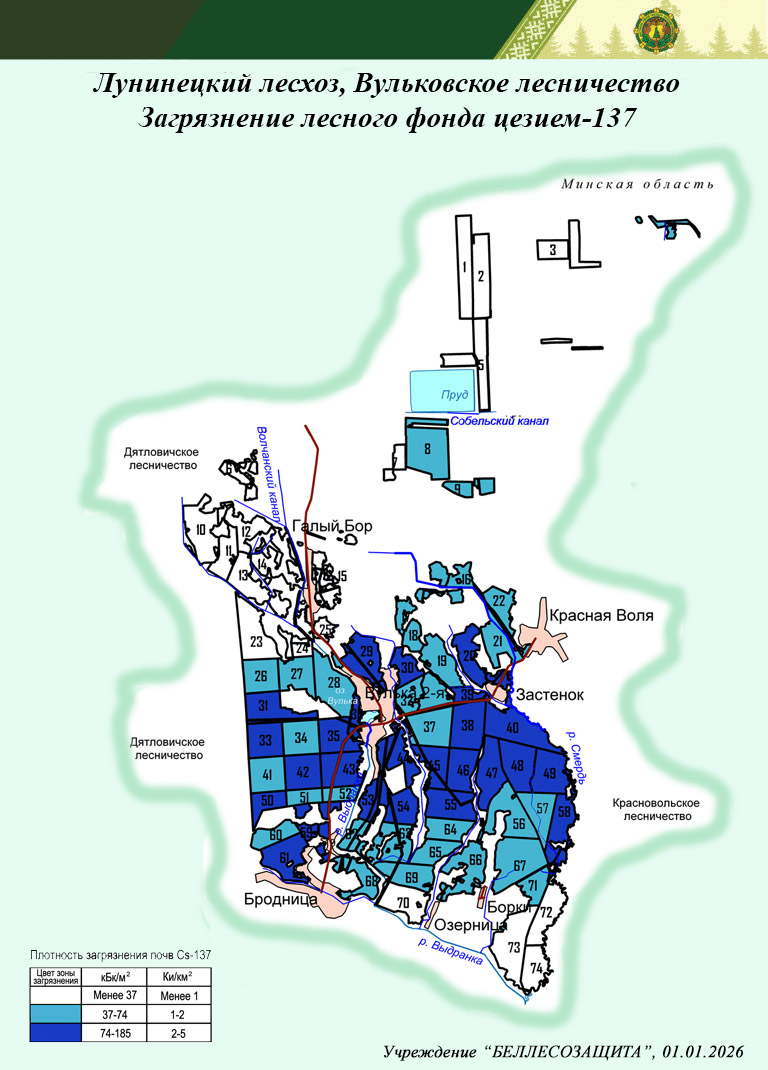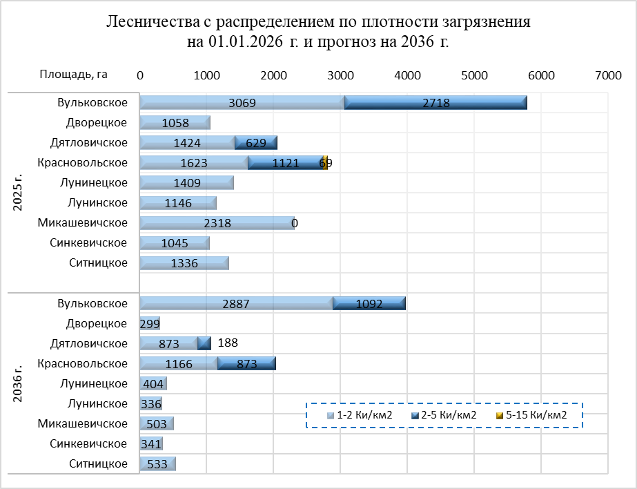 Радиоактивное загрязнение лесного фонда в лесничествах Лунинецкого лесхоза в 2026 г. и прогноз на 01.01.2035 г.