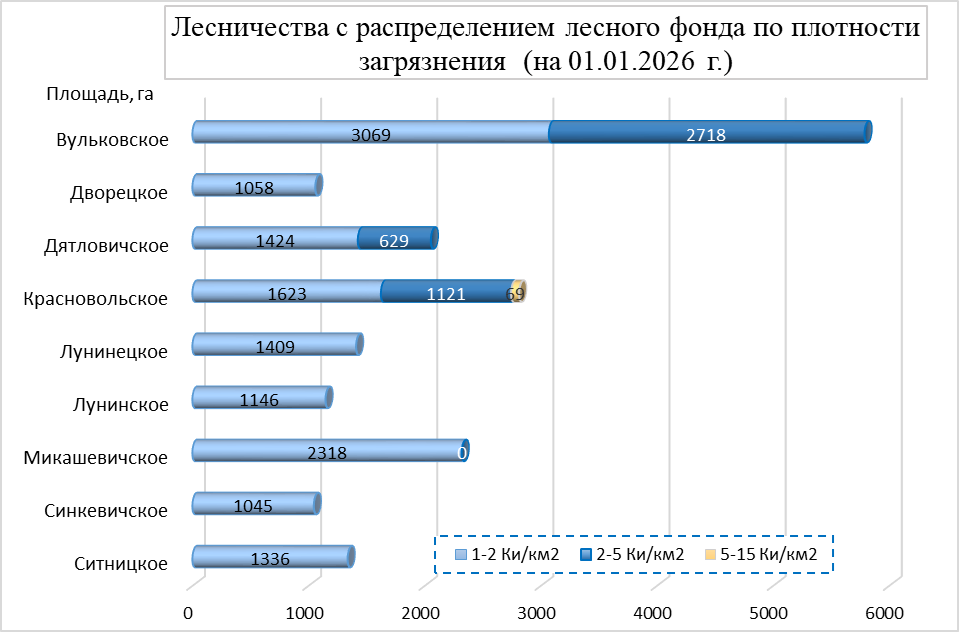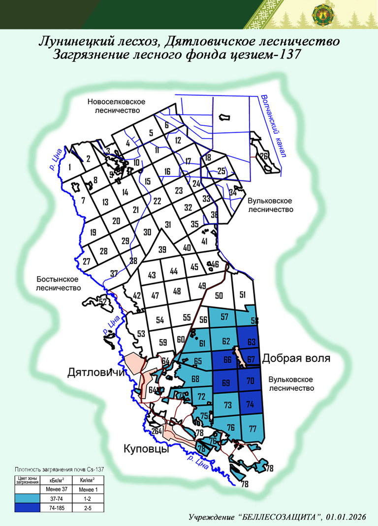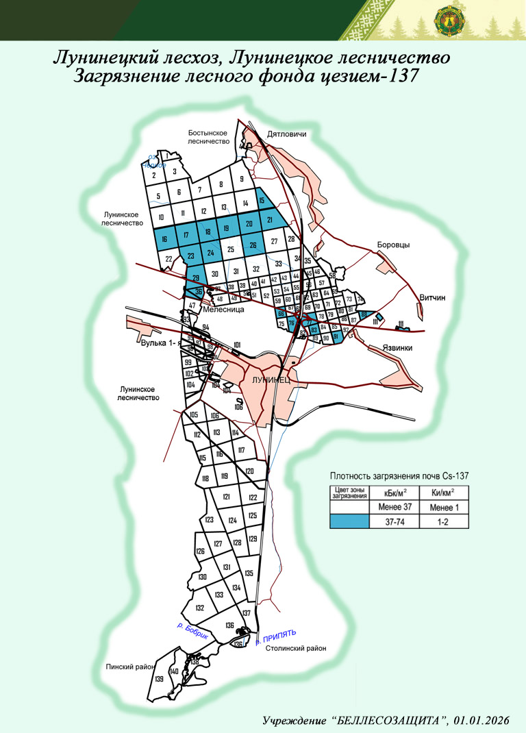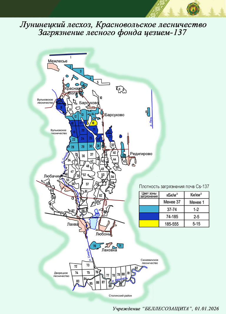 Распределение территории лесного фонда по плотности загрязнения почв цезием-137 в лесничествах Лунинецкого лесхоза (на 01.01.2026)