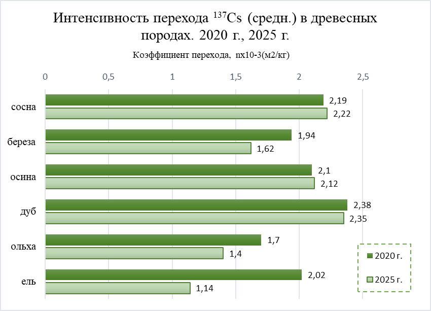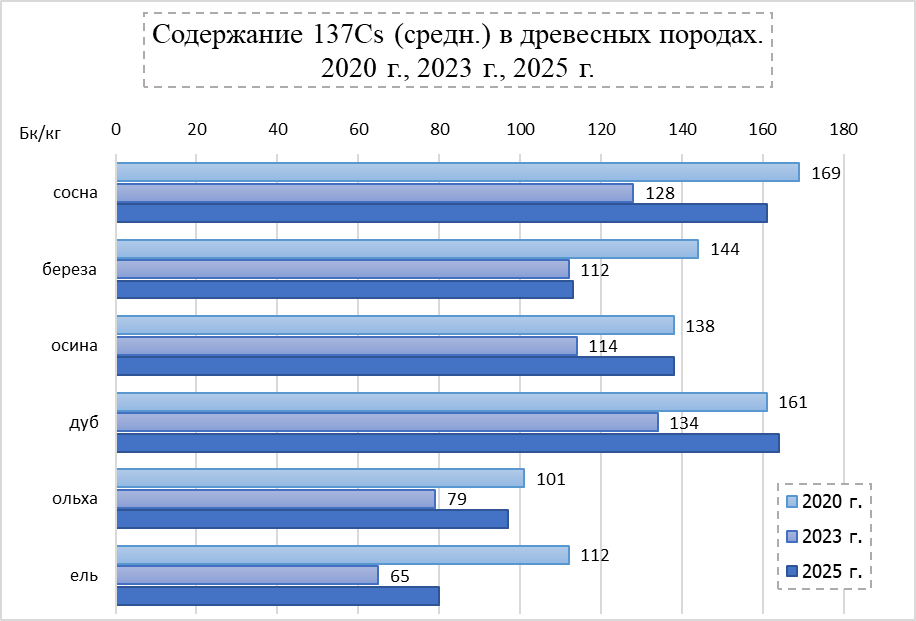 Содержание цезия-137 (среднее) в основных лесообразующих породах с 2020 по 2025 год
