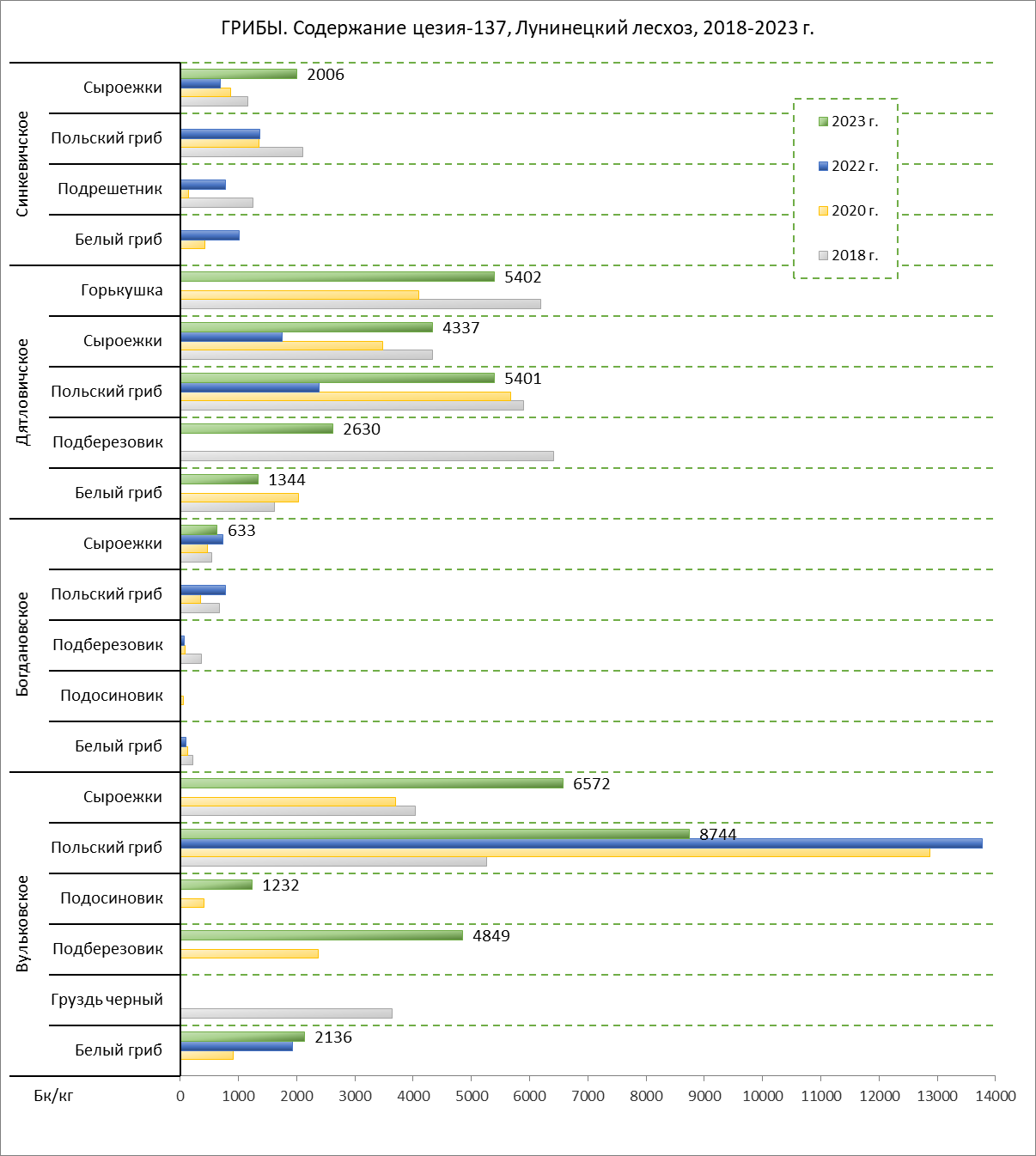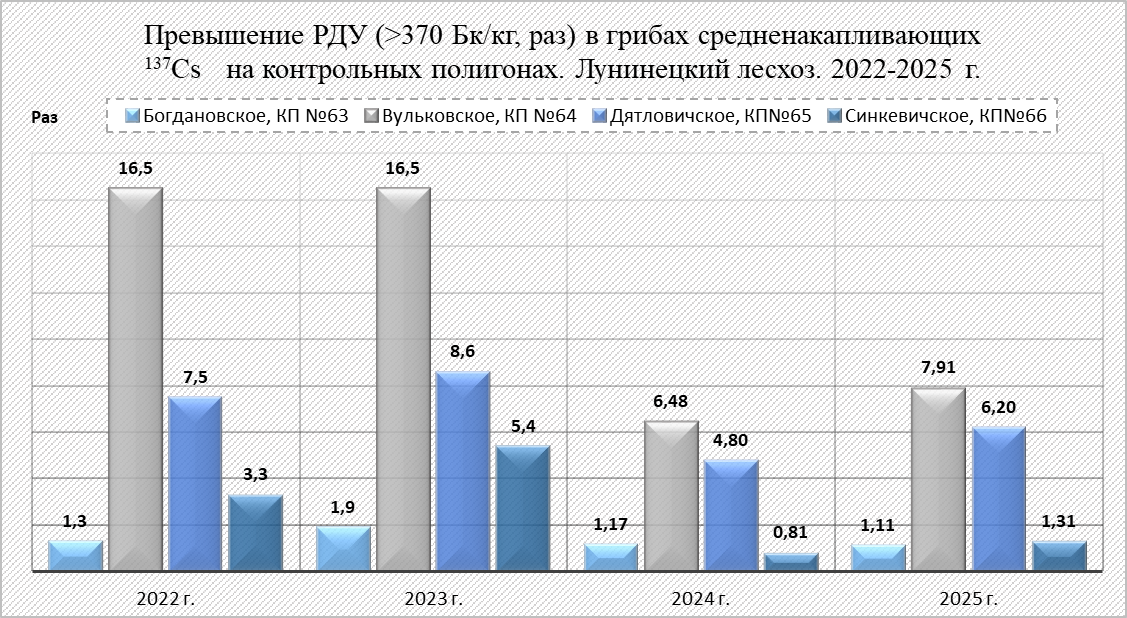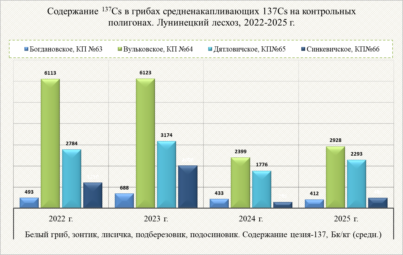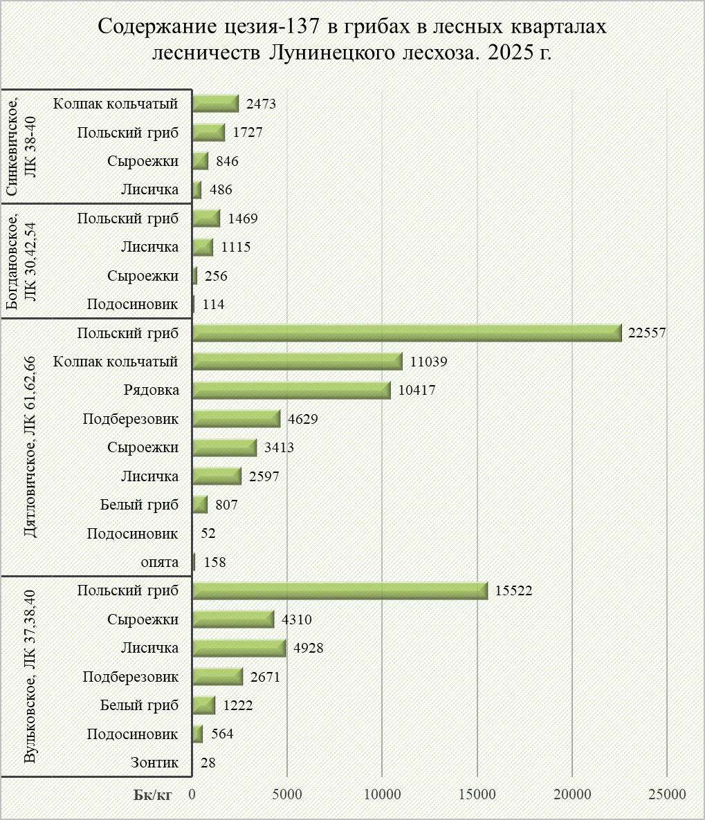 Содержание цезия-137 (среднее) в грибах на территории лесных кварталов, на контрольных полигонах (№ 65, 66, 67, 68) в лесничествах Лунинецкого лесхоза. 2026 год.