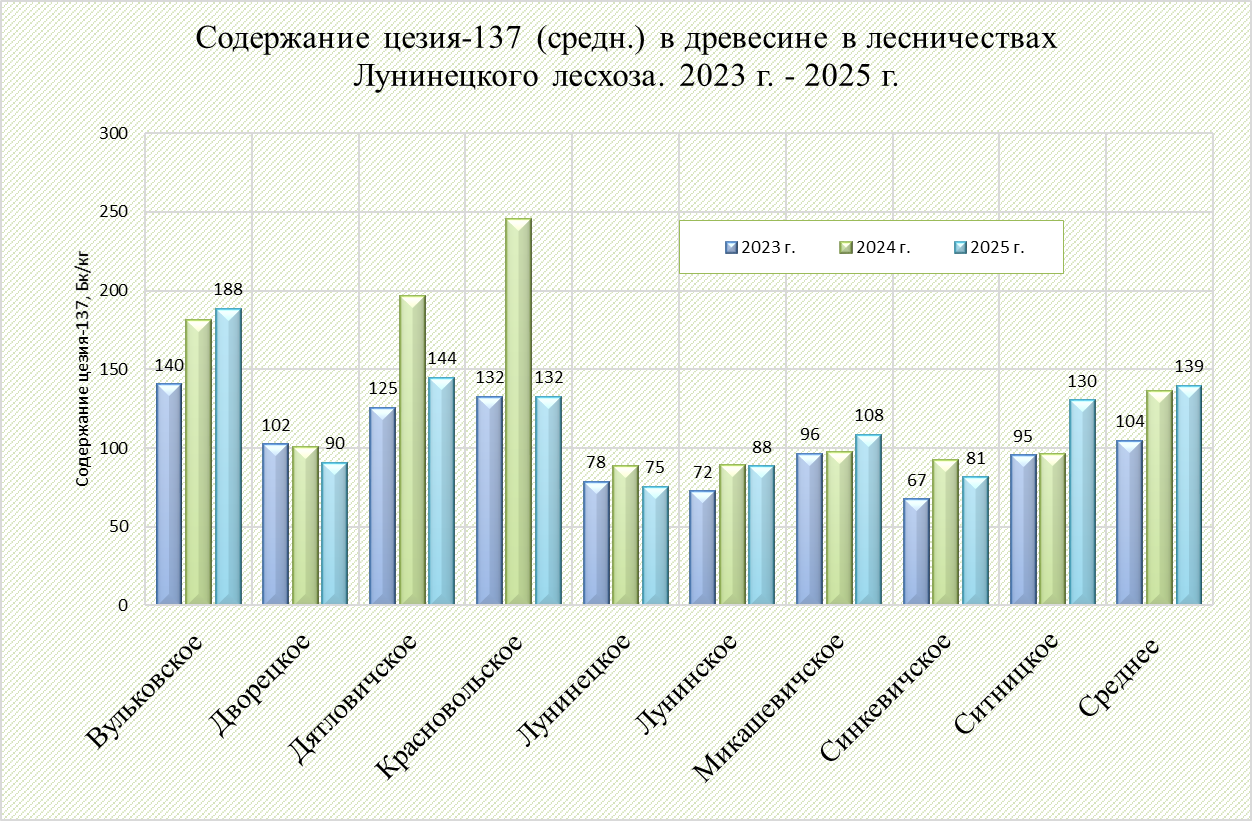 Содержание цезия-137 (среднее) в древесине по лесничествам с 2023 по 2025 год